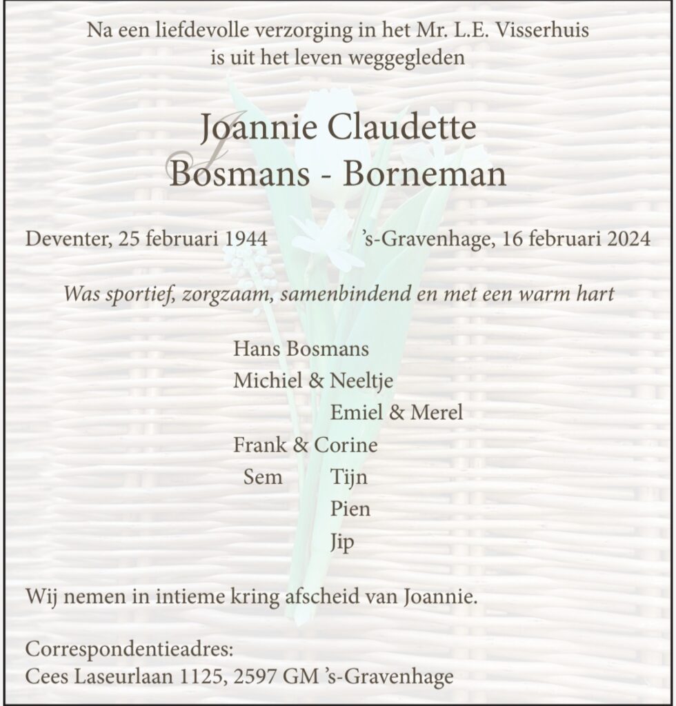 Nieuws 23 februari 2024 23 februari 2024 Helaas hebben wij het verdrietige bericht ontvangen dat Joannie is overleden. Zij is 25 jaar een zeer gewaardeerd lid van HRR geweest. Wij wensen haar dierbaren veel sterkte toe.